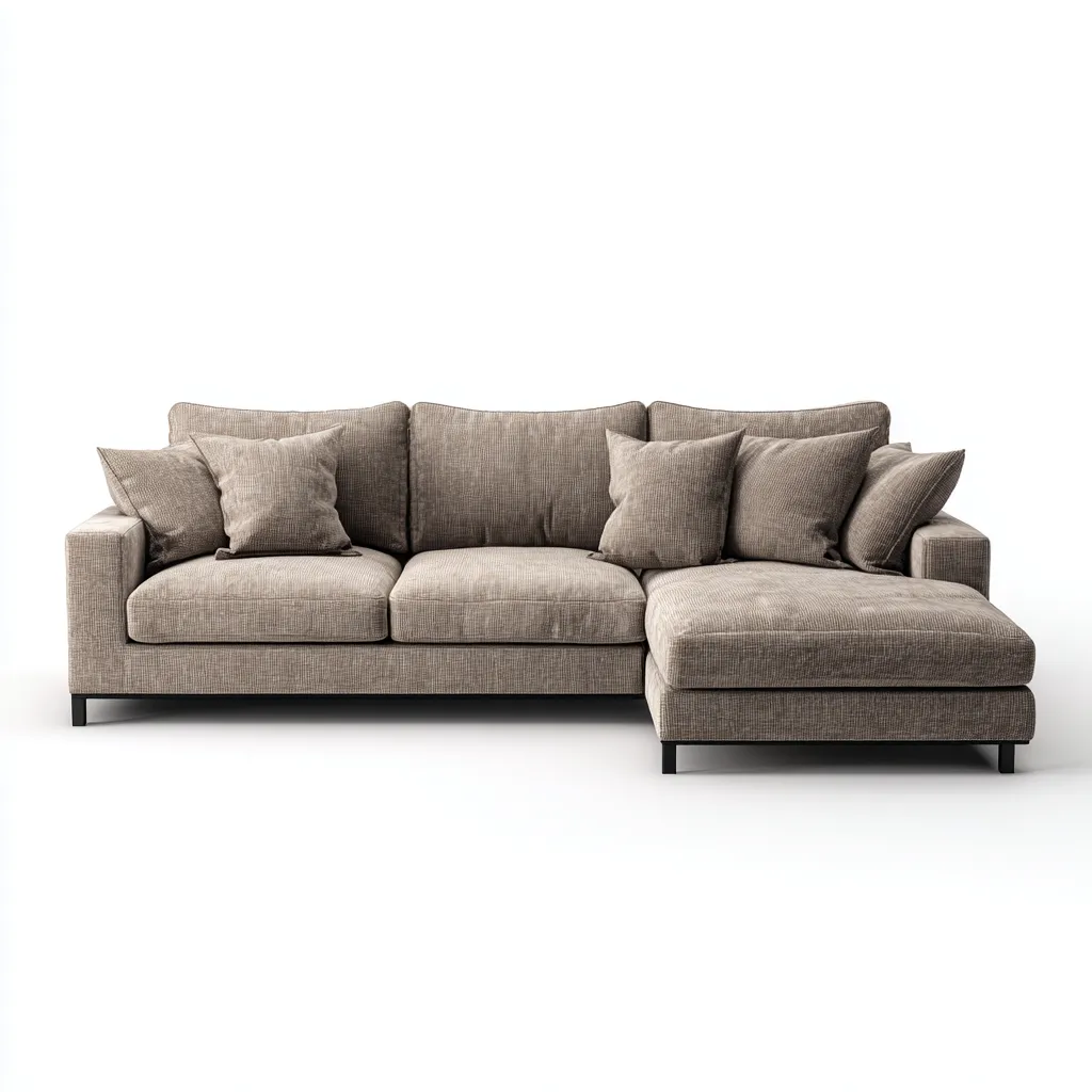 Este sofá rinconero presenta un diseño moderno con líneas limpias y una estructura robusta, ideal para crear un ambiente cómodo y funcional en la sala de estar. Su forma amplia ofrece un espacio de descanso relajado para el uso diario.