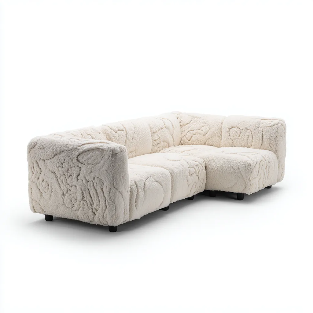 Tapizado en tela de color blanco roto con una textura suave y voluminosa, ideal para aportar confort y estilo al ambiente. La base resistente proporciona estabilidad durante el uso.