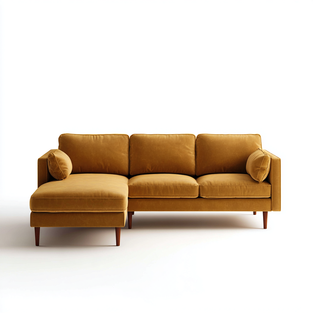 Tapizado en tela aterciopelada de color amarillo mostaza, suave al tacto y adecuada para un uso continuado. La base y las patas proporcionan una estructura resistente y estable.
